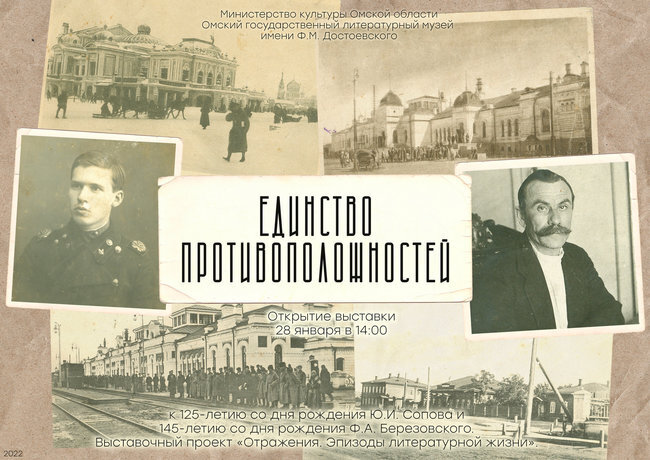 Проект будет открыт выставкой «Единство противоположностей», посвященной 125-летию со дня рождения поэта Юрия Ивановича Сопова и 145-летию со дня рождения писателя Феоктиста Алексеевича Березовского. Их жизнь совпала с событиями, изменившими мир, — революцией и Гражданской войной в России. Они жили и творили в одно время, но были по разную сторону баррикад.